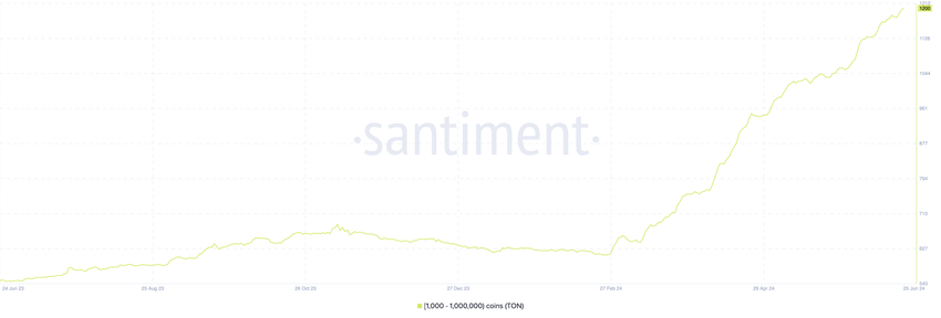 Attualmente, questa coorte di whale TON è composta da 1.200 indirizzi, segnando il livello più alto di sempre.