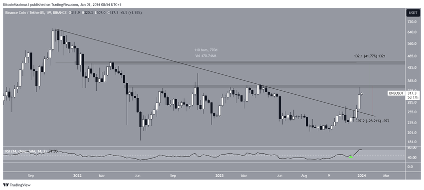 Il prezzo di BNB è aumentato dall’ottobre 2023, quando scambiava a un minimo di 202 dollari. Il movimento verso l’alto ha causato il breakout di una linea di tendenza discendente a lungo termine che era rimasta in vigore per più di 770 giorni. Il rialzo ha portato a un massimo di 320 dollari la scorsa settimana.