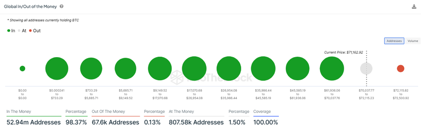 Nel frattempo, il prezzo del Bitcoin continua a mostrare forza, scambiare a 71.162 dollari al momento della scrittura. I dati dell’aggregatore sul blockchain IntoTheBlock offrono spunti interessanti. Ai prezzi attuali, il 98,375% dei possessori di BTC ha profitti non realizzati (in the money). Questo dato è relativo all’abissale 0,13%, che è seduto su perdite non realizzate (out of the money).