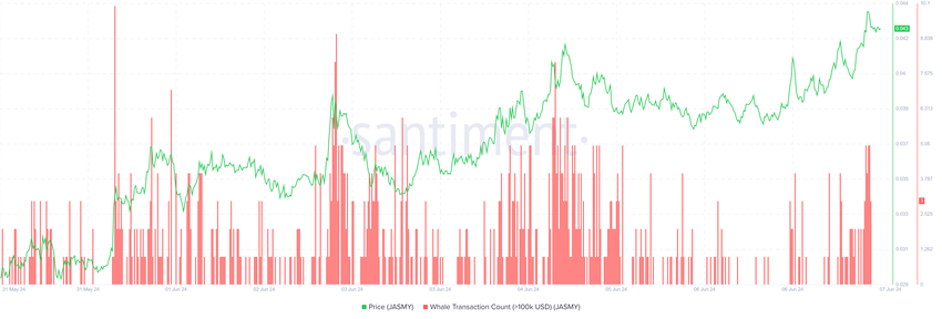 Le prospettive per JASMY sono state le stesse di ADA e SHIB, con le transazioni whale che sono raddoppiate a circa 8 nel mese di giugno da circa 3 nel mese di maggio.