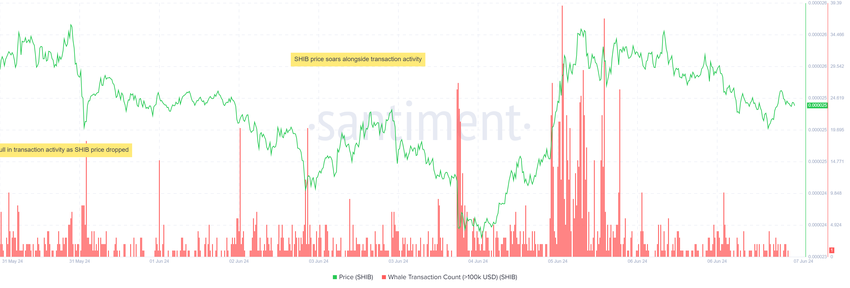 Tuttavia, la situazione si è ribaltata a giugno, quando il prezzo dello SHIB è decollato in seguito all’impennata delle transazioni, che ha raggiunto il culmine il 6 giugno con circa 39 transazioni di whale rispetto alle 18 transazioni registrate il 31 maggio. In questo periodo, anche lo SHIB è salito del 5%.