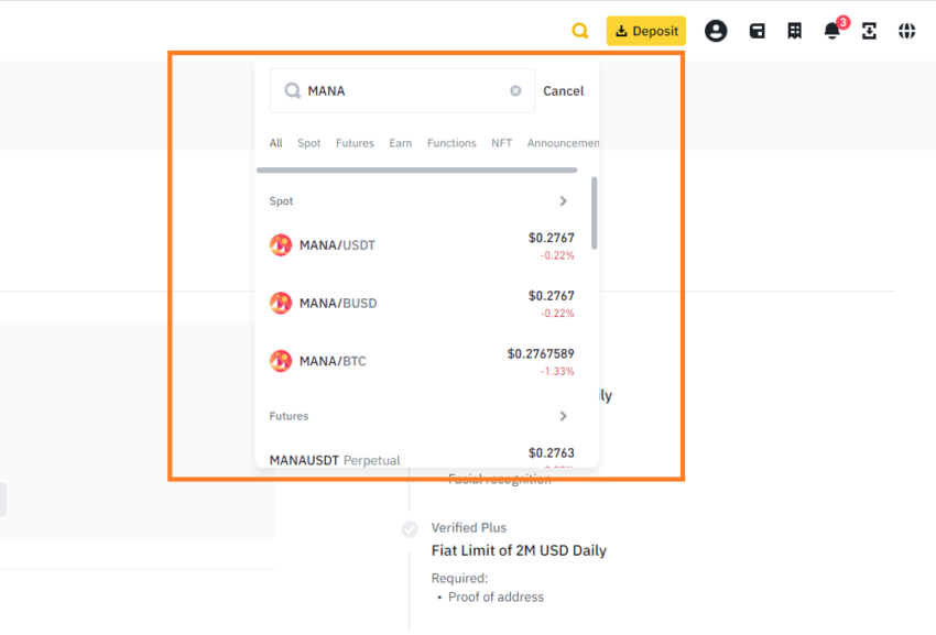 Individuate la coppia di scambio per la criptovaluta che volete scambiare con MANA. Ad esempio, se volete acquistare MANA con USDT, cercate la coppia di scambio MANA/USDT. Se state acquistando MANA con valuta fiat, potete procedere direttamente all’acquisto di MANA una volta che il vostro deposito in valuta fiat è stato elaborato.