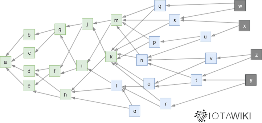 IOTA utilizza il Tangle. Il Tangle è un grafo aciclico diretto (DAG) che viene utilizzato nella rete IOTA per convalidare e registrare le transazioni. A differenza delle tipiche blockchain, che aggregano le transazioni in blocchi e le aggiungono a una catena, ogni transazione Tangle deve confermare due transazioni precedenti, dando vita a una struttura simile a una rete.