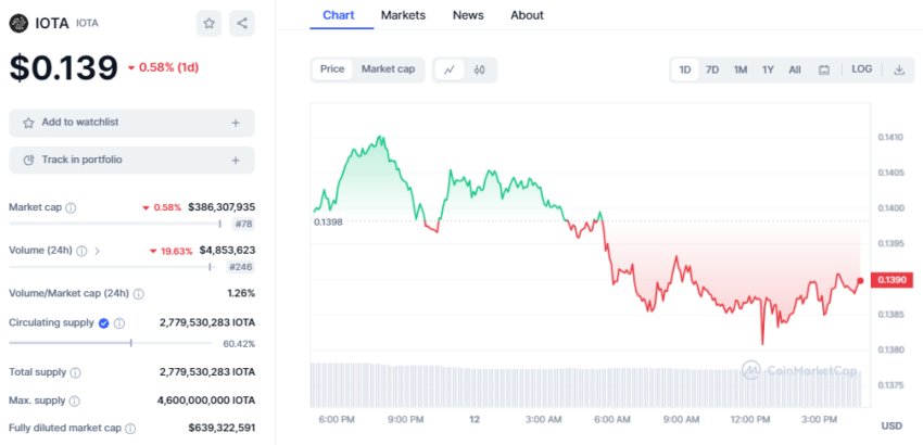 Rispetto alle altre criptovalute, IOTA è al 77° posto in termini di maggiore market cap, con 386 milioni di dollari. Per quanto riguarda il volume di scambi nelle 24 ore, IOTA è attualmente al 97° posto.