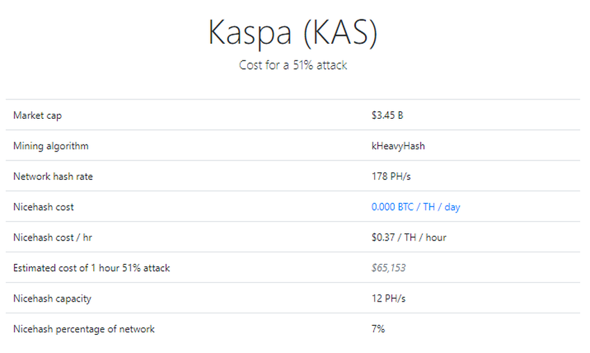 Secondo questa metrica, il costo per attaccare Kaspa per un’ora è significativamente inferiore a quello di Bitcoin, con un costo di circa 61.153 dollari. D’altra parte, se si utilizza la metrica per l’affitto della potenza hash per calcolare il costo dell’attacco di Bitcoin, si arriva a circa 2,8 milioni di dollari, secondo il sito web di Crypto51.