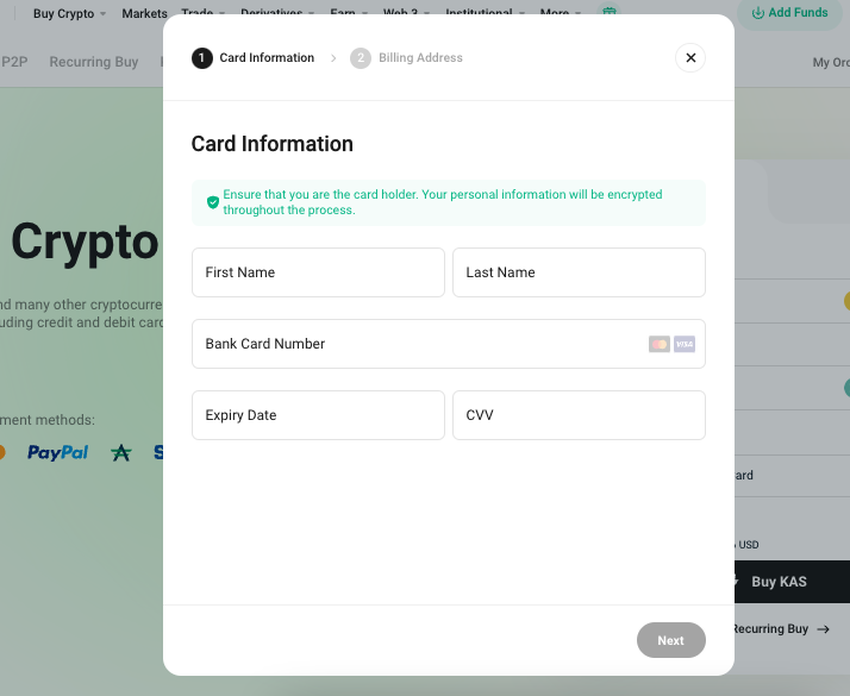 6. Selezionare il metodo di pagamento ed esaminare i dettagli: Scegliere il metodo di pagamento preferito tra le opzioni disponibili (ad esempio, carta di credito, bonifico bancario). Ricontrollare i dettagli della transazione, includendo il costo totale e la quantità di KAS che si sta acquistando.