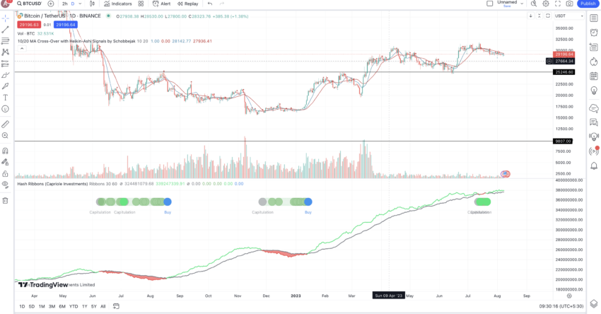 Come investitori, dovreste aspettare un aumento delle entrate dei minatori dopo l’halving per entrare. Per quanto riguarda i nastri di hash, il prerequisito è che la capitolazione del miner sia terminata. Una volta che ciò accade, è possibile applicare l’analisi tecnica per individuare il momento migliore per acquistare bitcoin.