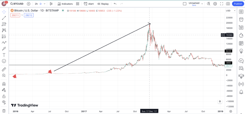 Post-halving: Tuttavia, nei 18 mesi successivi, il BTC ha sperimentato una sorta di massiccio rialzismo, che ha spinto i prezzi a quasi 20.000 dollari nel dicembre 2017. L’arco temporale di riferimento è di 18 mesi.