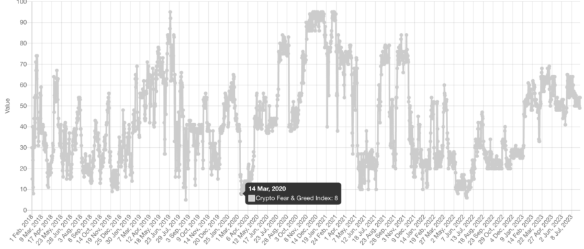 Si tratta di un indicatore di sentiment che misura le emozioni prevalenti degli investitori nel mercato delle criptovalute. Il suo valore varia da 0 a 100.