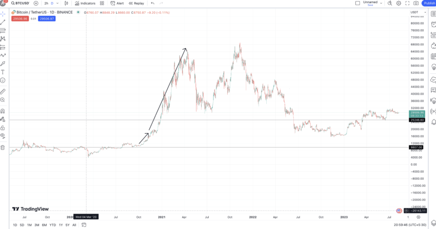 Post-halving: Nei successivi 11 mesi – entro aprile 2023 – il BTC è salito fino a 65.000 dollari, dimostrando che nemmeno gli effetti post-pandemia sono riusciti a tenere il BTC al ribasso. L’arco temporale di riferimento è di 11 mesi.