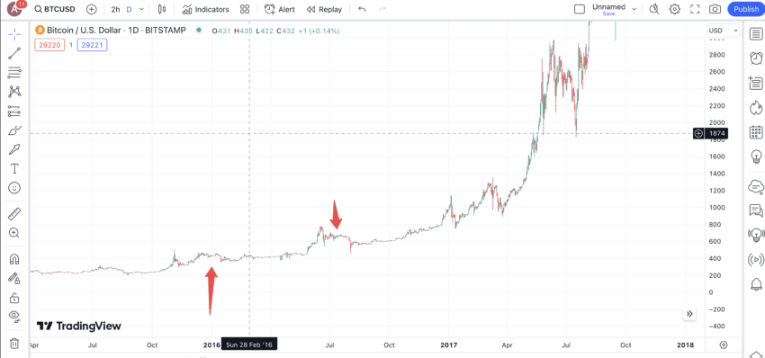 Pre-halving: All’inizio del 2016, il BTC scambiava a 420 dollari (circa). La preparazione all’evento di dimezzamento di luglio ha spinto i prezzi a quasi 680 dollari (circa). L’arco temporale di riferimento è di sei mesi.