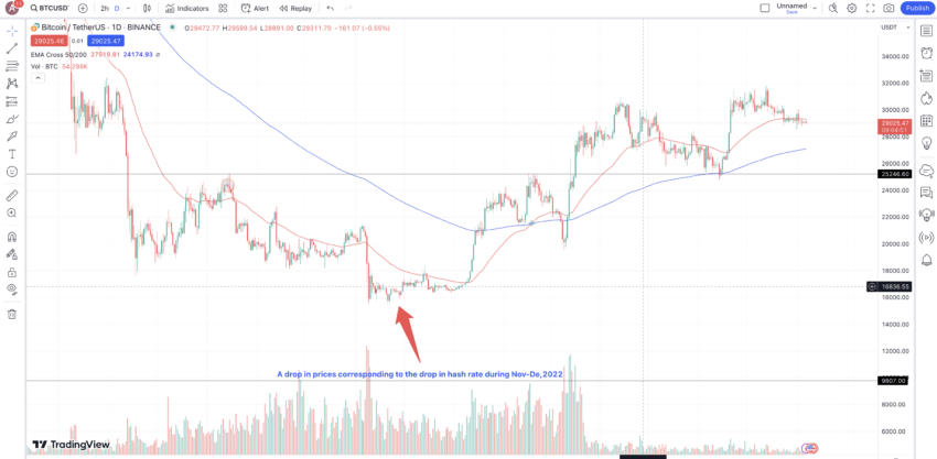 - Monitorare le principali tendenze dei prezzi in correlazione con il sentimento del mercato, soprattutto prima dell’halving. L’idea è quella di trovare il giusto punto di ingresso. Ad esempio, se qualcuno avesse seguito i segnali di acquisto alimentati dai nastri hash per individuare i macro minimi, si sarebbe potuto individuare quello vicino ai 16.000 dollari per BTC verso la fine del 2022. Tuttavia, questo non ha fatto scattare immediatamente un segnale di acquisto, poiché l’indicatore ha aspettato che il prezzo si stabilizzasse.