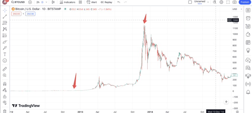 Sì, il prezzo del Bitcoin è salito ogni volta dopo il dimezzamento. Tuttavia, l’aumento del prezzo non è solo un evento successivo al dimezzamento. Poiché la compravendita di BTC continua anche prima che gli effetti del dimezzamento si manifestino, si sono verificati casi di aumento dei prezzi mesi prima che le ricompense dei blocchi venissero dimezzate. Analizziamo ora ogni ciclo di dimezzamento da una prospettiva storica. Ecco come si sono mossi i prezzi in precedenza: