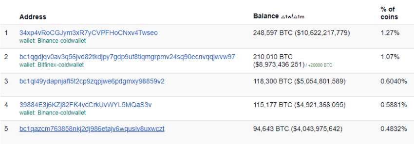 Come mostrato nell’immagine sottostante, due dei primi cinque portafogli con il saldo più alto appartengono a Binance. Tuttavia, questo non significa necessariamente che Binance possieda la maggior parte dei Bitcoin, perché una buona parte delle monete che detiene sono in realtà fondi degli utenti depositati presso il piattaformadiscambio.