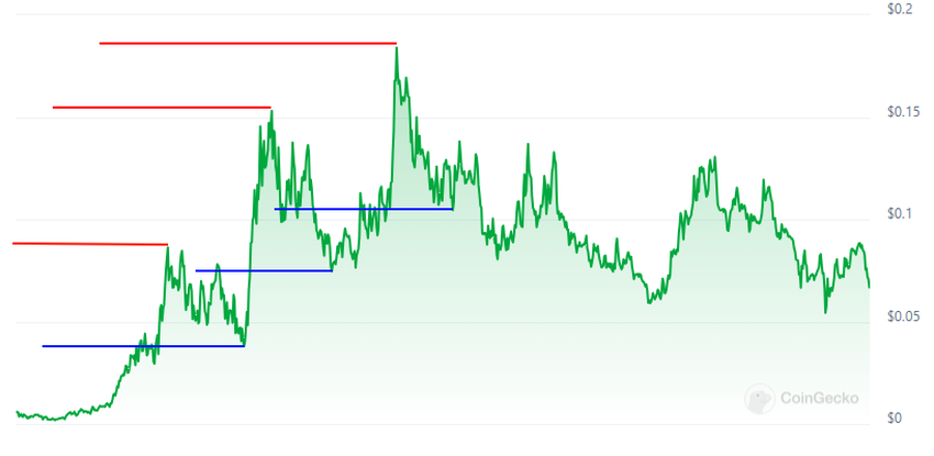 Possiamo approfondire questo aspetto nell’esempio seguente. NORMIE ha fatto registrare massimi (in rosso) e minimi (in blu) fino a raggiungere il suo massimo storico il 26 marzo 2024.