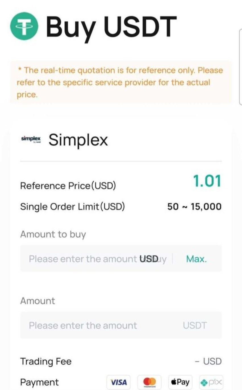 3. Scegliete la moneta con cui volete finanziare il vostro conto. Qui abbiamo selezionato USDT. Inserite la quantità che desiderate acquistare e scegliete tra diversi metodi di pagamento, includendo carta di debito/credito e Apple Pay.