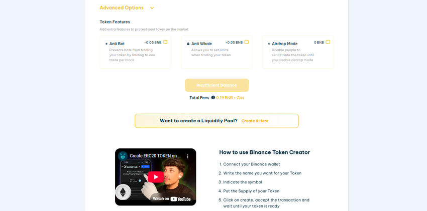 Avrai bisogno di almeno 0,19 BNB per lanciare la tua meme coin e di ulteriori 0,05 BNB per aggiungere le caratteristiche Anti-Bot o Anti-Balena su Smithii.
