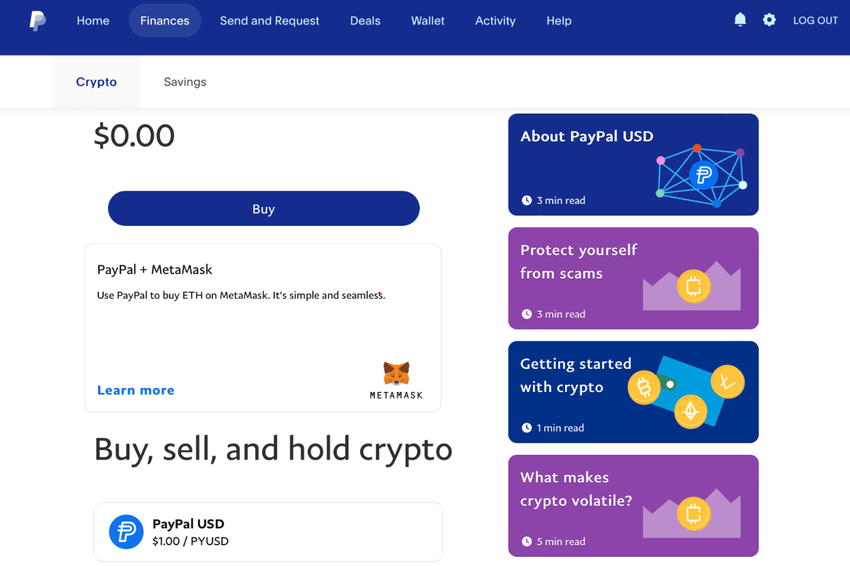 Fase 2: nel cruscotto di PayPal, andare alla sezione “Cripto”. Qui vedrete il PYUSD elencato insieme a opzioni come il bitcoin.