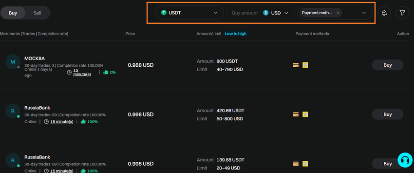 Puoi filtrare le offerte dei venditori in base alla tua scelta di valuta fiat, importo di acquisto e metodi di pagamento — come contanti, bonifico bancario o wallet mobile.