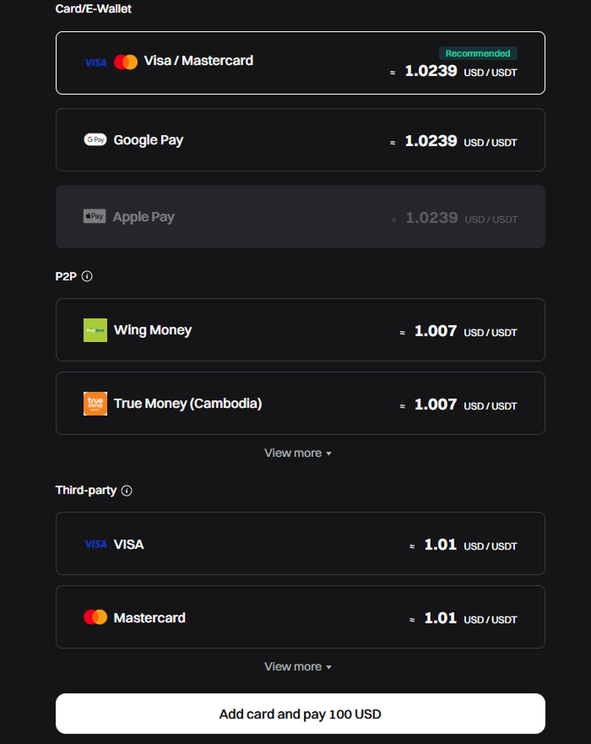 1. Acquista utilizzando carta di credito o debito: seleziona la tua valuta locale, inserisci l’importo e scegli USDT come token. Segui le istruzioni per completare la transazione utilizzando la tua carta Visa o Mastercard.