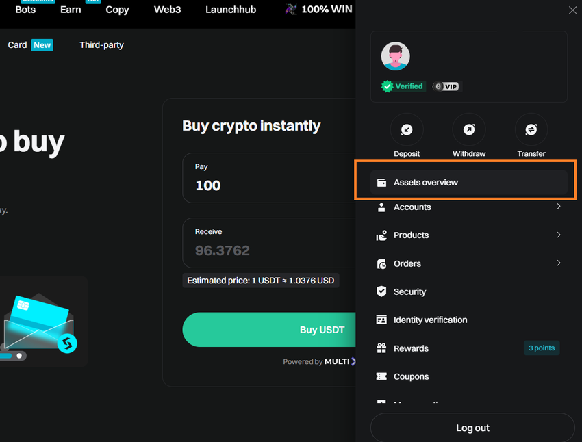 Dopo che il pagamento è stato effettuato e confermato, gli USDT verranno rilasciati nel tuo wallet Bitget. Puoi controllare il saldo aggiornato navigando su “Panoramica degli asset”.