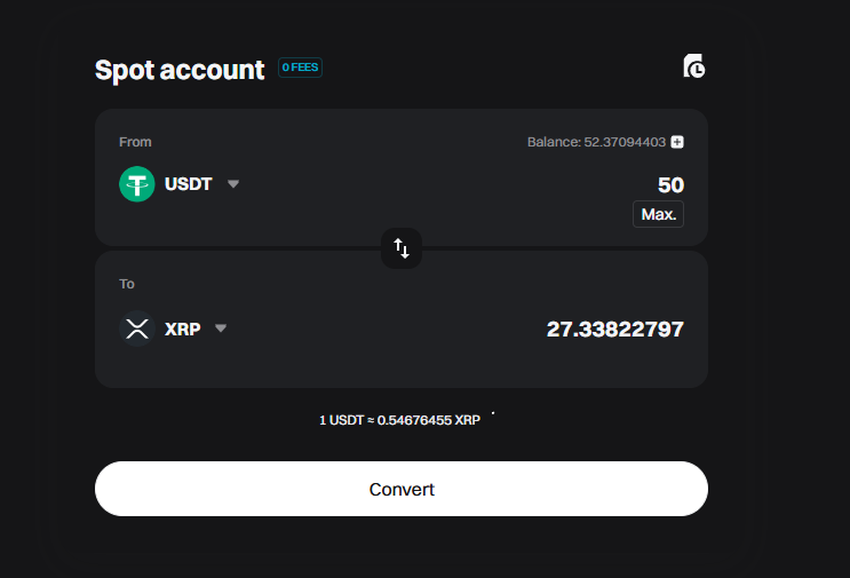Puoi anche utilizzare l’opzione Exchange per convertire i tuoi USDT in altri asset come Bitcoin (BTC) o Ripple (XRP). Vai semplicemente su Trading > Convert, seleziona gli asset che vuoi convertire, inserisci l’importo che desideri scambiare e poi seleziona Convert. Facile!
