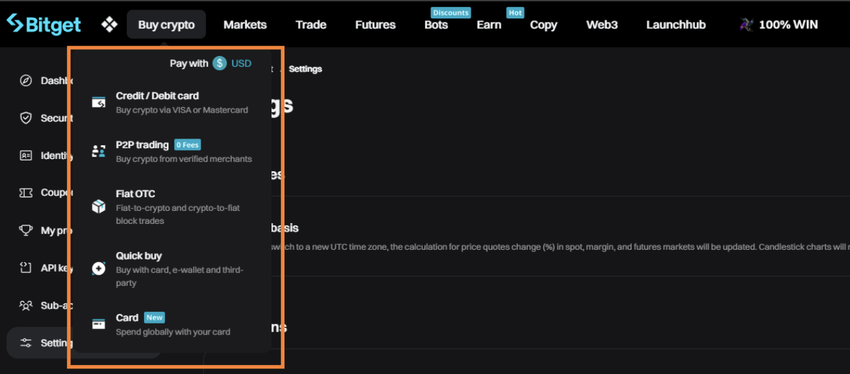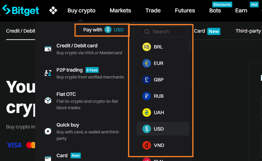 Puoi anche selezionare la tua valuta fiat preferita dal menu a tendina “Acquista Crypto” come mostrato nell’immagine qui sotto.
