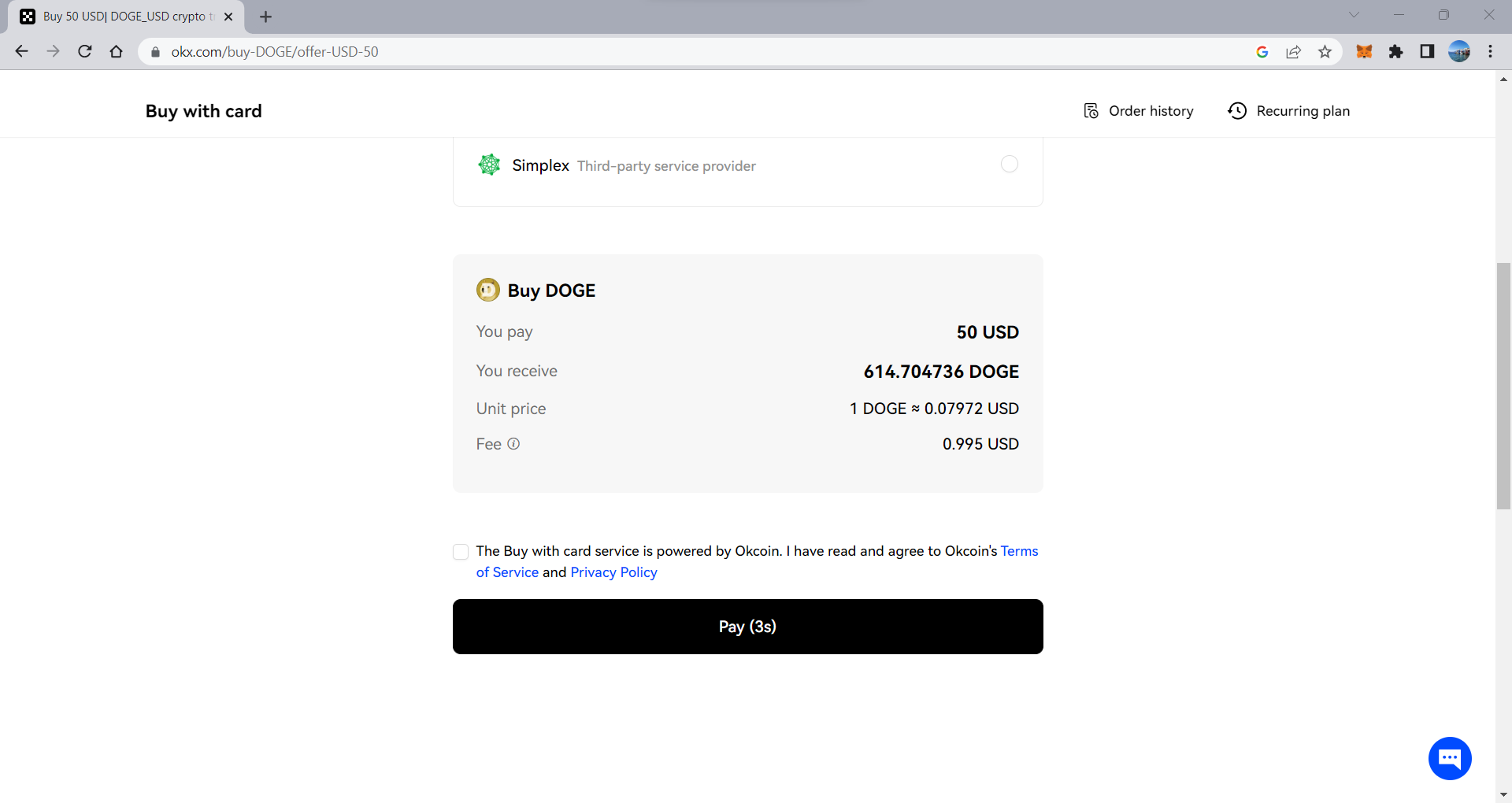 - Scorrere verso il basso per vedere un’anteprima del tasso di piattaformadiscambio che si riceverà. Premete “Paga” per acquistare. Se non avete ancora inserito i dati della vostra carta o completato alcuni requisiti KYC, vi verrà richiesto di farlo.
