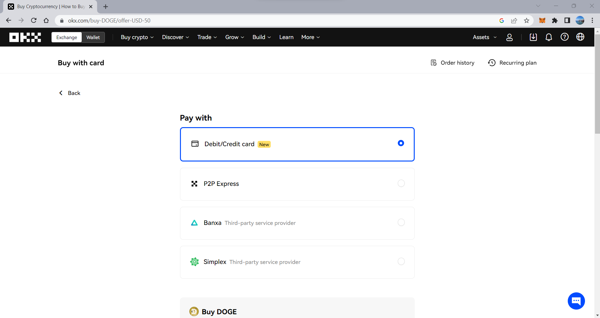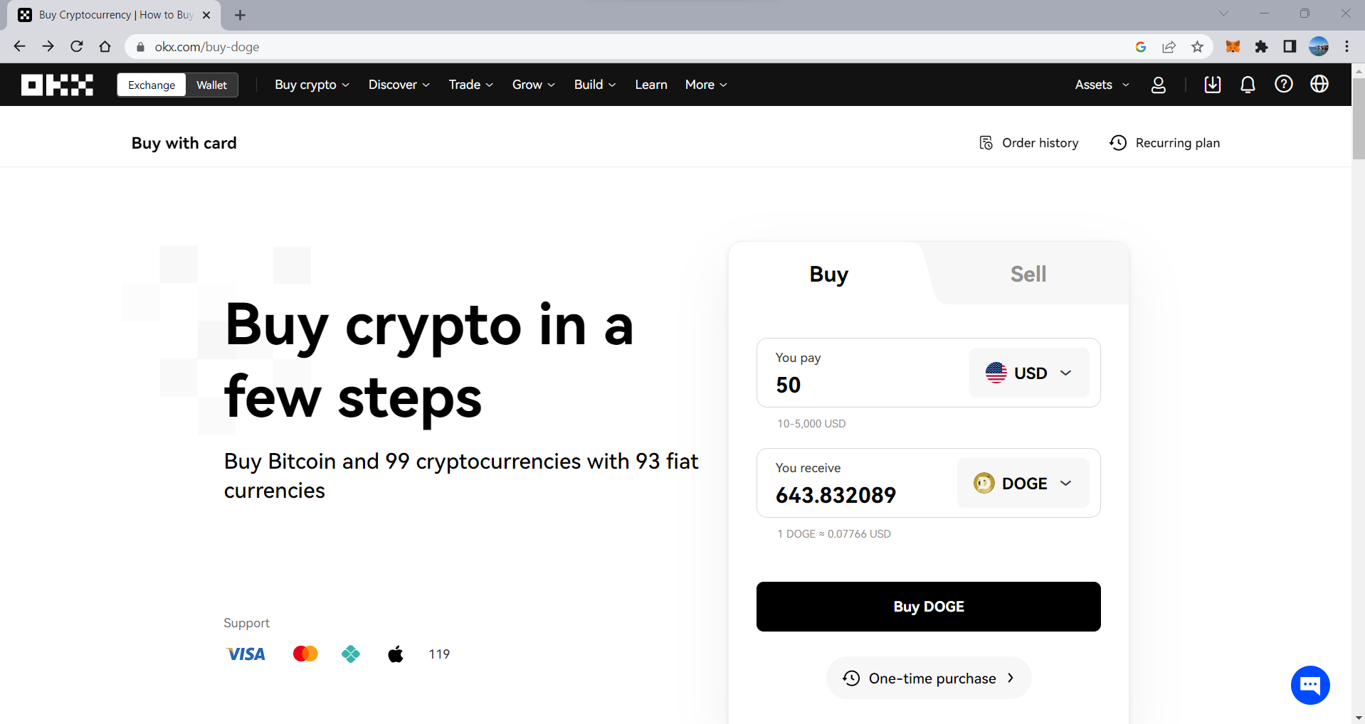 Le monete meme sono facili da acquistare sulla maggior parte delle principali criptovalute. Il processo richiede solo pochi passaggi su piattaforme semplici da usare come OKX. Ecco un esempio di come acquistare rapidamente Dogecoin tramite OKX.