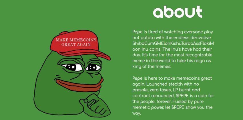 Operando senza un team formale o una roadmap, PEPE serve puramente come asset d’intrattenimento. Pur ispirandosi all’amato meme Pepe, i creatori chiariscono che il token PEPE non ha alcuna affiliazione con Matt Furie o con la sua creazione, Pepe la rana.