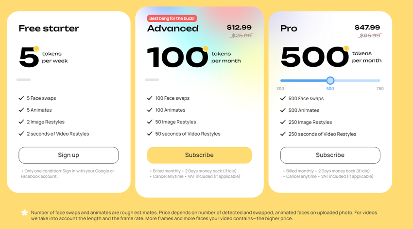 Per quanto riguarda i prezzi, Reface offre un pacchetto iniziale gratuito che include cinque token gratuiti a settimana. Se il piano gratuito non vi soddisfa, potete provare i piani Advanced (12,99 dollari al mese, 100 token) e Pro (49,99 dollari al mese, 500 token).
