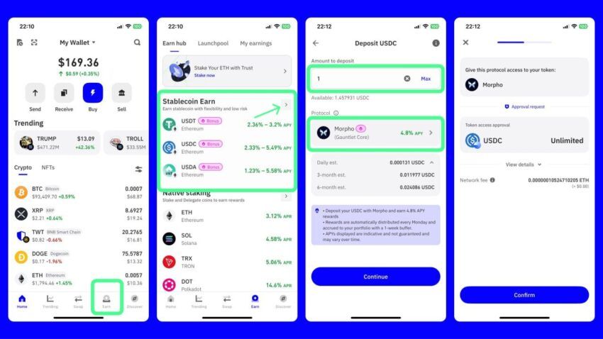 Come uno dei portafogli non-custodial più popolari, TrustWallet dà a oltre 200 milioni di utenti in tutto il mondo accesso a milioni di asset crypto. Ha stabilito una reputazione di fiducia e sicurezza e ora offre alcuni dei migliori rendimenti sulle stablecoin attraverso la sua funzione Stablecoin Earn.