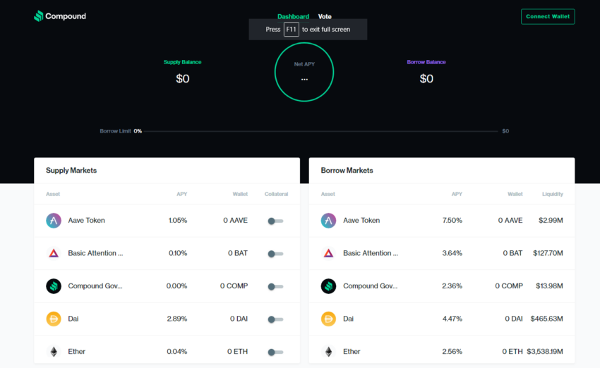 Compound Finance è un protocollo di lending DeFi. Gli utenti possono depositare criptovalute e guadagnare interessi o prendere in prestito asset crypto contro di esse. Compound utilizza smart contract per automatizzare la gestione e l’archiviazione del capitale in criptovalute fornito dagli utenti.