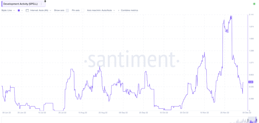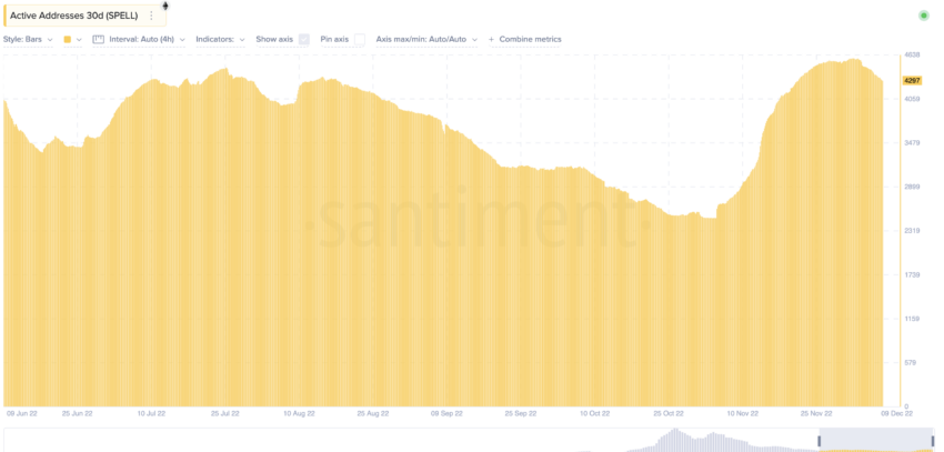 Il volume sociale del token SPELL è stato costante da giugno a novembre 2022, anche se con alcune impennate a inizio settembre e inizio novembre. Questo può avere un impatto sui valori di previsione del prezzo di SPELL a breve termine.