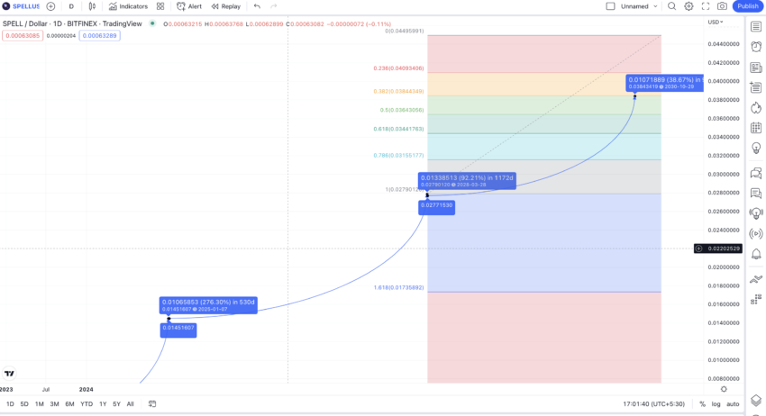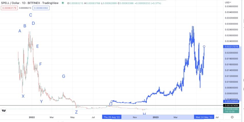 Come si può vedere, il prezzo di SPELL è relativamente piatto e basso dal maggio 2022. Pertanto, prenderemo il modello precedente e cercheremo di proiettarlo ulteriormente per identificare eventuali altri modelli di prezzo futuri.