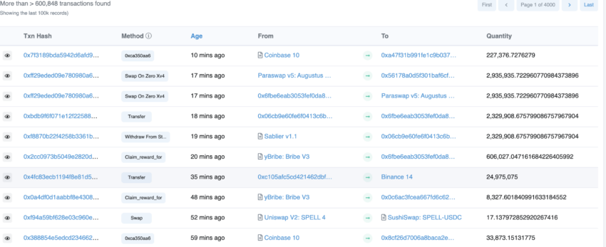Idati di Etherscan mostrano che le transazioni di SPELL da un portafoglio all’altro sono frequenti. Ecco le principali transazioni e i loro dettagli al 9 dicembre 2022.
