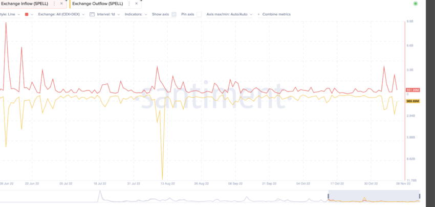 Questo sembra positivo per SPELL e le persone non stanno spingendo aggressivamente i loro token verso le piattaformadiscambio per venderli. Tuttavia, i bassi prezzi di SPELL possono anche essere un’altra ragione per cui i tassi di afflusso e deflusso si bilanciano.