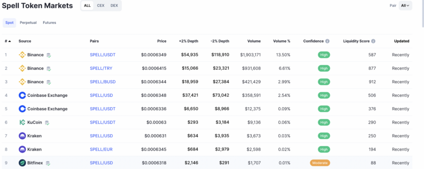 Nonostante sia un token di amministrazione, SPELL ha uno spread di scambiare a pronti decente per quanto riguarda la sua presenza sul mercato a partire dal 2022. La coppia SPELL-USDT ha un volume di scambi decente con un’elevata fiducia e un punteggio di liquidità decente. Binance mostra un punteggio di liquidità SPELL-BUSD superiore a 900, un indicatore positivo per gli investitori che cercano deviazioni di prezzo minime e volatilità minima.