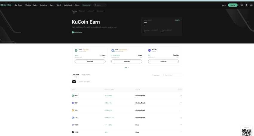 In KuCoin, lo scambiare criptovalute non è l’unico modo per generare reddito. Potete affidarvi alle diverse offerte di KuCoin Earn per continuare a guadagnare profitti stabili. L’intero approccio prevede una gestione professionale degli asset, che consente di scegliere tra i piani “Bilanciato”, “Avanzato” e “Specializzato”.