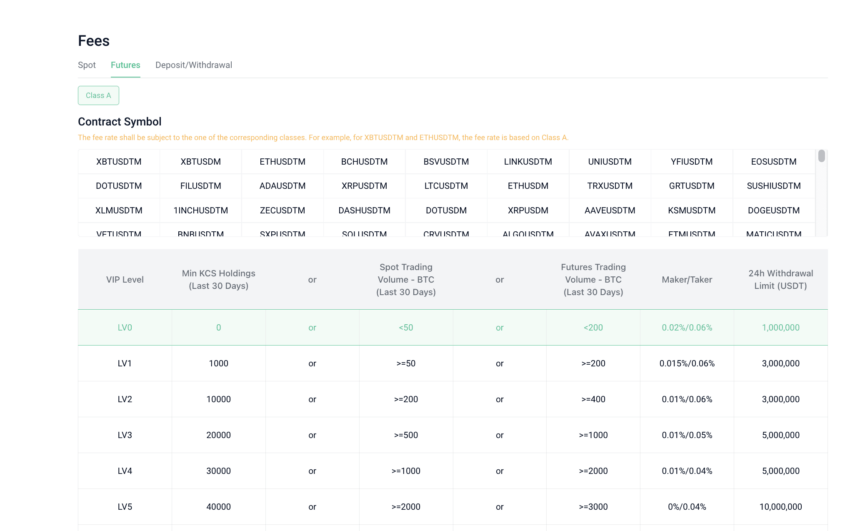 KuCoin è molto trasparente per quanto riguarda la struttura delle commissioni. Se il vostro obiettivo è lo scambiare a pronti, le percentuali massime delle commissioni di maker e taker sono fissate allo 0,1% per ciascuna delle monete di Classe A, allo 0,2% per le monete di Classe B e allo 0,3% per le monete di Classe C.