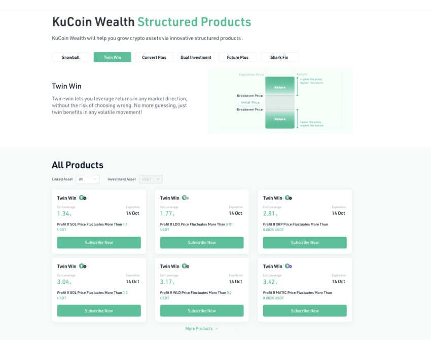 Vale la pena notare che KuCoin Earn non è solo un’offerta di guadagno passivo basata sull’interesse. Permette invece di accedere a prodotti strutturati di guadagno come Protective Earn, Dual Investment, Twin-Twin con un approccio a rischio zero e altri ancora.
