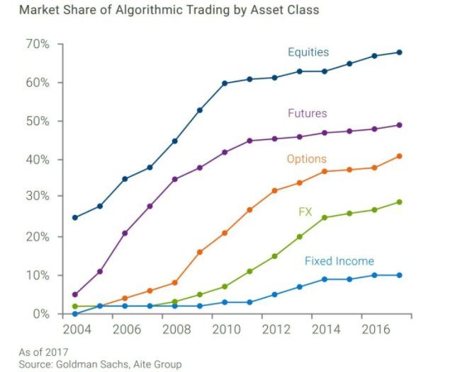 Nel 2017, AITE Group ha rilasciato un rapporto che fornisce approfondimenti sull’adozione e l’impatto dello scambiare algoritmico nel 21° secolo. Il trading algoritmico utilizza programmi informatici per scambiare ad alta velocità e volumi, spesso chiamato trading ad alta frequenza (HFT). Il grafico seguente illustra la penetrazione del trading algoritmico in vari mercati finanziari a partire dal 2004.