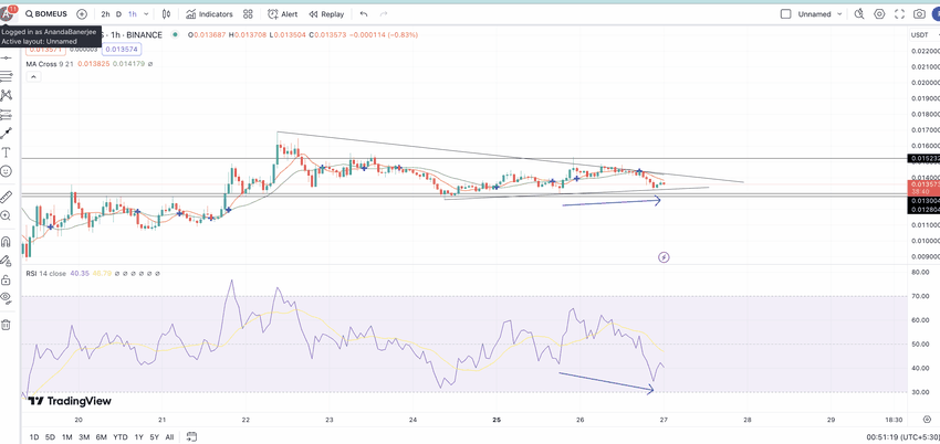 BOME è un token relativamente nuovo nel 2024. Pertanto, non disponiamo di molti dati di trading su cui fare affidamento. Tenendo questo in mente, consideriamo prima un’analisi tecnica a breve termine per capire come potrebbe muoversi il prezzo di BOME nella prima parte del 2024.