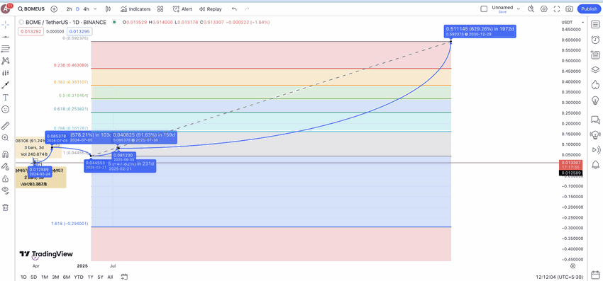 Ora che abbiamo in vista il minimo e il massimo del 2025, è possibile estrapolare le cifre fino all’anno 2030 utilizzando l’indicatore di ritracciamento Fib. Anche se l’estrapolazione potrebbe non essere sempre lineare, fornisce un livello approssimativo a cui il prezzo di BOME può scalare, a condizione che l’adozione della rete e la popolarità aumentino.