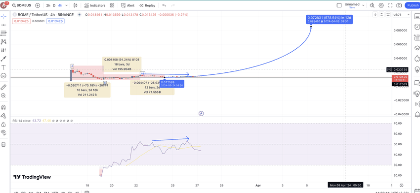 Notate come WIF abbia iniziato in modo aggressivo e abbia continuato a scalare nuovi massimi, come mostrato dal grafico a quattro ore. Un breakout al di sopra del massimo della giornata di quotazione ha innescato nuovi massimi per questa moneta meme. Per BOME, il livello da superare sarebbe quindi 0,029 dollari.