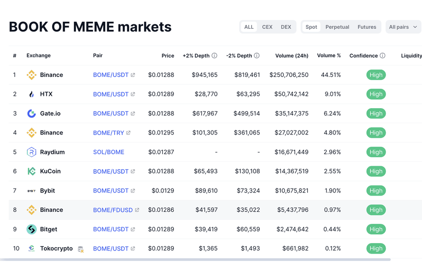 Inoltre, ecco i principali mercati di BOME nel caso in cui vogliate cercare altri CEX e DEX per scambiare questa moneta meme alimentata da Solana.