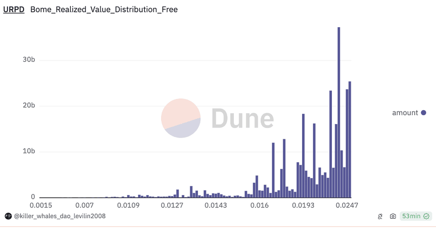 Inoltre, si noti come i livelli di Unspent Realized Price Distribution (URPD) di BOME si siano costantemente alzati. In parole povere, questo indica diversi livelli di resistenza del prezzo, il che significa che i detentori hanno acquistato token BOME a un prezzo più alto e potrebbero vendere se il prezzo raggiungesse i loro massimi preferiti o i livelli di resistenza.