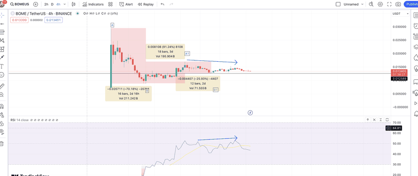 Se guardiamo al grafico a quattro ore di BOME, emerge una tendenza interessante. Si noti come il grafico a quattro ore di BOME riveli un modello completato, A-B-A1, con un altro modello A1-B1-X in corso. Prendiamo i movimenti chiave del prezzo e della distanza per individuare i movimenti medi del prezzo.