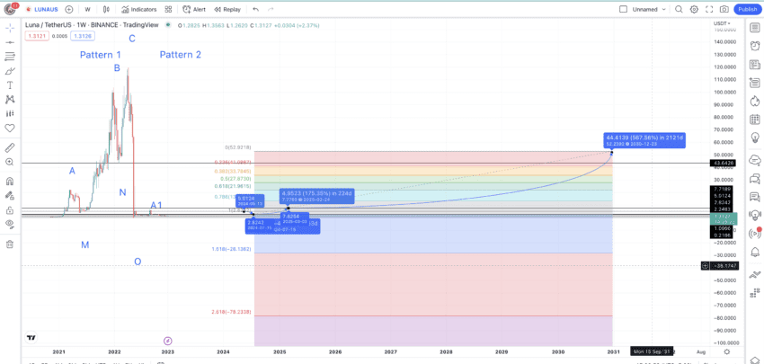 Con il minimo del 2024 e il massimo del 2025 con cui lavorare, possiamo collegare i punti per estrapolare le previsioni del prezzo di LUNA fino al 2023. Tracciando lo stesso percorso di crescita, possiamo mettere la previsione del prezzo di LUNA per il 2030 a $52,92 secondo l’estensione di Fibonacci.