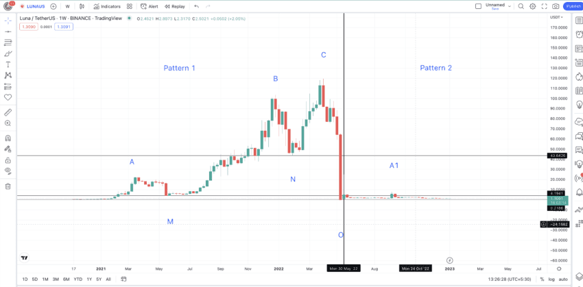 Pertanto, i tre massimi più alti potrebbero essere lo schema ricorrente per il prezzo di LUNA in futuro. Abbiamo diviso il grafico a lungo termine di LUNA in due segmenti: schema uno e schema due.